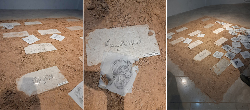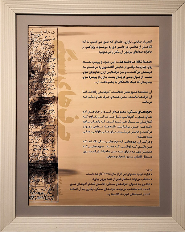 «صمد! نگاه...ماه بلنده ها..!»، «این واکسنایی که میزنن همه اش آب برکه ست»، «خانومای گلم! ریمل! خُرده مژه دار... بدون خرده مژه نخری پشمون میشیا»، «هزار مریضی ها داره ولی هنوز زنده است» و دیگرانی از این دست. رویِ تِکِّه سنگ ها دستمال کاغذی هایی چَند، این سو و آن سو به هم ریخته. رویِ دستمال هایِ تا شده و باز، نقشِ چهره هایی کامل یا نیمْ پرداخته در احوالاتی گوناگون. خَموده، خیره، با ماسک، نگاه هایی نگران یا مطمئن و بیشتر با لَب هایی فرو بسته. تلاش می کنی به نوشته ها فکر کنی که گویی از گفتار روزمره آدم هایِ عادی برآمده اند. ارتباطی بیابی میان کاغذها و سنگ. خاکِ یَله شده بر گفتار. دختری عینکی کنار دستت به زمزمه: «انگار قبرستونه». کوششی دیگر به وارَسیِ بیشتر. خاک گسترده زیرِ پا و نوشته هایِ به سنگ مبتلا. شبیه نمایشگاه هایِ پیشین نیست که قاب هایِ نقاشی ای بر دیوار باشد و چون زائری کهن، طوافت که تمام شد با رویِ باز از نقاش یا آدمی که احتمالا با لبخندی گشاده منتظرت دم در ایستاده سپاسگزاری کنی و بروی پیِ زندگی. شاید اینجا هم همین کار را بکنی. سر که بلند می کنی می بینی کسی با صدایِ آرام دارد برای چند نفر چیزهایی را توضیح می دهد. می خواهی به آن جمع بپیوندی که نگاهت گره می خورد به قابی بر دیوار. بر زمینه ای قهوه ایِ روشن با واژگانی سیاه. راهنمایِ نمایشگاه؟ بیانیه؟ چند توضیح؟